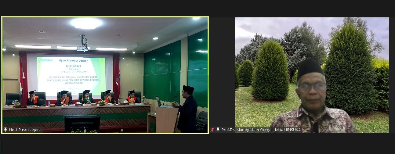 Kamis (07/09/2023) Helmianor berhasil mempertahankan disertasinya yang berjudul “Internalisasi dan Aktualisasi Nilai Religius, Disiplin dan Tanggung Jawab pada Santri Pondok Pesantren di Kalimantan Selatan” dihadapan tujuh (7) orang penguji, yaitu Prof. Dr. H. Mujiburrahman, MA sebagai Ketua Penguji, Dr. Muhammad Iqbal, M.S.I sebagai Penguji Utama, Prof. Dr. H. Maragustam, MA sebagai Penguji Eksternal, Prof. Dr. H. Zulfa Jamalie, M.Pd., Prof. Dr. H. Ridhahani Fidzi, M.Pd., Prof. Dr. Saifuddin Ahmad Husin, MA sebagai Penguji dan Dr. H. Fahmi Hamdi, Lc., MA sebagai Sekretaris bertempat di Aula Pascasarjana UIN Antasari Banjarmasin dan Via Zoom Meeting.