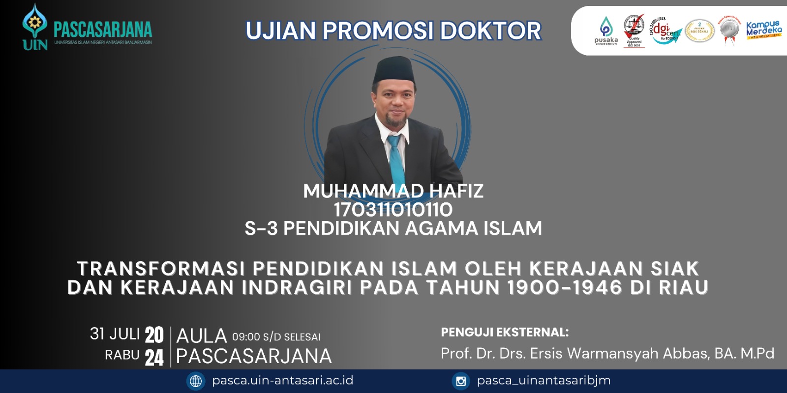 Muhammad Hafiz dengan NIM 170311010110 akan mempresentasikan hasil penelitian disertasinya dengan judul “Transformasi pendidikan islam oleh kerajaan siak dan kerajaan indragiri pada tahun 1900-1946 di riau” Dengan penguji Eksternal oleh Prof. Dr. Drs. Ersis Warmansyah Abbas, BA. M.Pd
