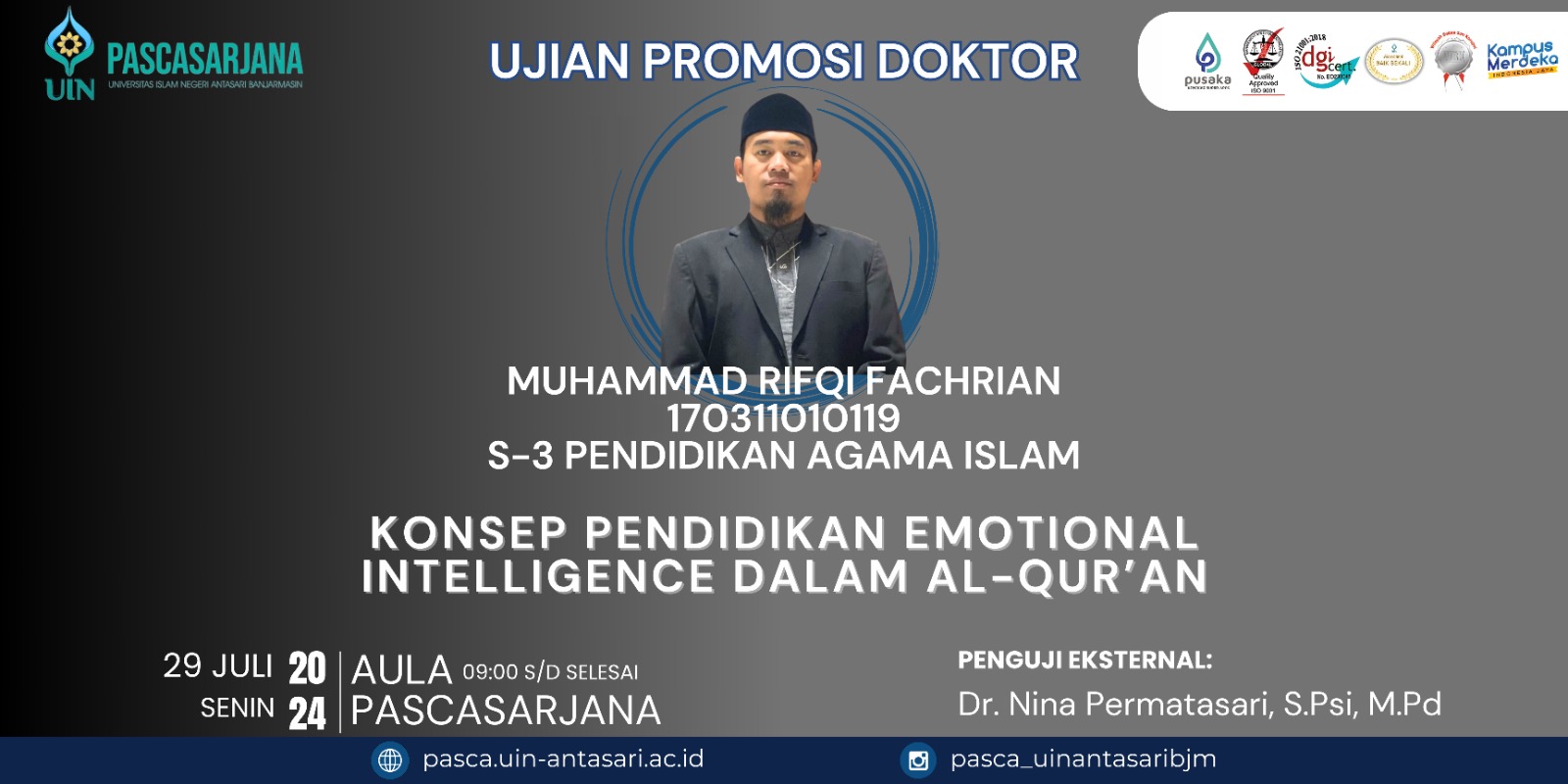 Muhammad Rifqi Fachrian dengan NIM 170311010119 akan mempresentasikan hasil penelitian disertasinya dengan judul “KONSEP PENDIDIKAN EMOTIONAL INTELLIGENCE DALAM AL-QUR’AN” Dengan penguji Eksternal oleh Dr. Nina Permatasari, S.Psi, M.Pd.