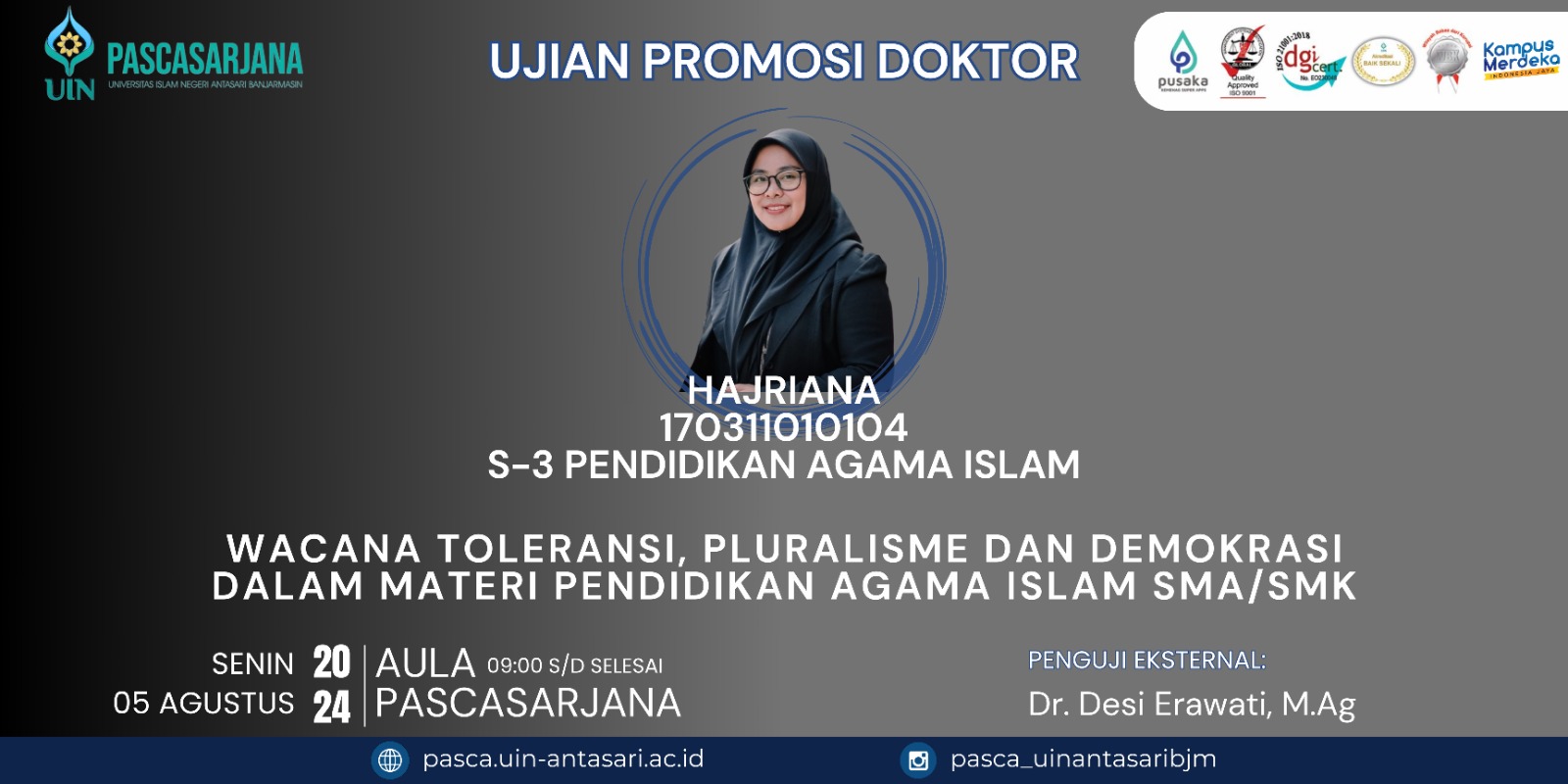 Hajriana dengan NIM 170311010104 akan mempresentasikan hasil penelitian disertasinya dengan judul “Wacana toleransi, pluralisme dan demokrasi dalam materi pendidikan agama islam sma/smk” Dengan penguji Eksternal oleh Dr. Desi Erawati, M.Ag.