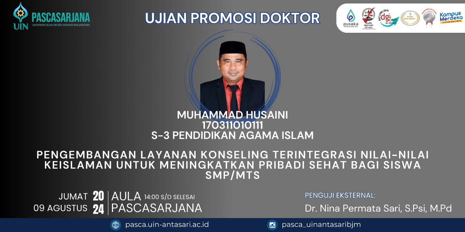Muhammad Husaini dengan NIM 170311010111 akan mempresentasikan hasil penelitian disertasinya dengan judul “Pengembangan layanan konseling terintegrasi nilai-nilai keislaman untuk meningkatkan pribadi sehat bagi siswa smp/mts” Dengan penguji Eksternal oleh Dr. Nina Permata Sari, S.Psi, M.Pd