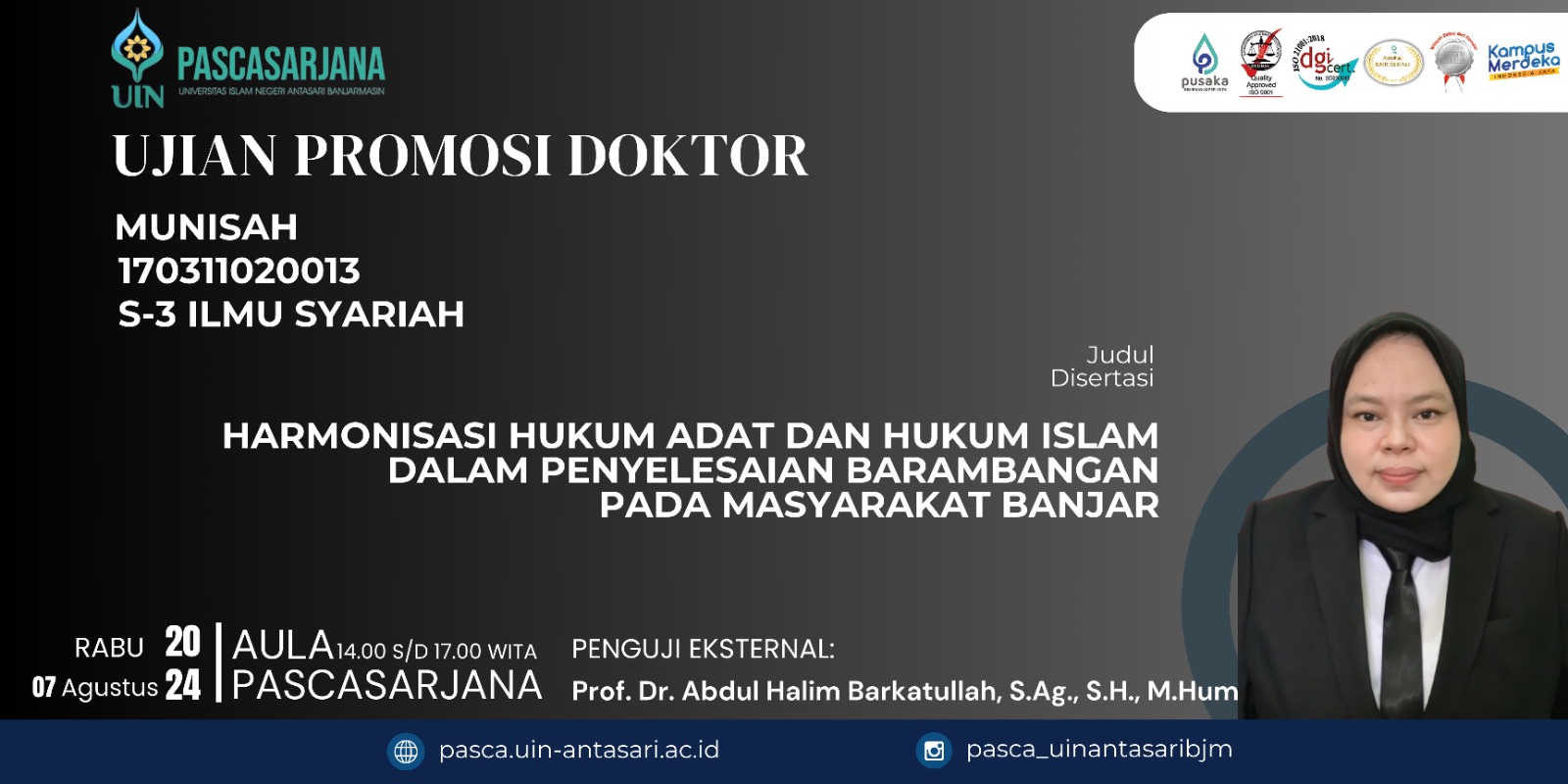 Munisah dengan NIM 170311020013 akan mempresentasikan hasil penelitian disertasinya dengan judul “Harmonisasi hukum adat dan hukum islam dalam penyelesaian barambangan pada masyarakat banjar” Dengan penguji Eksternal oleh Prof. Dr. Abdul Halim Barkatullah, S.Ag., S.H., M.Hum
