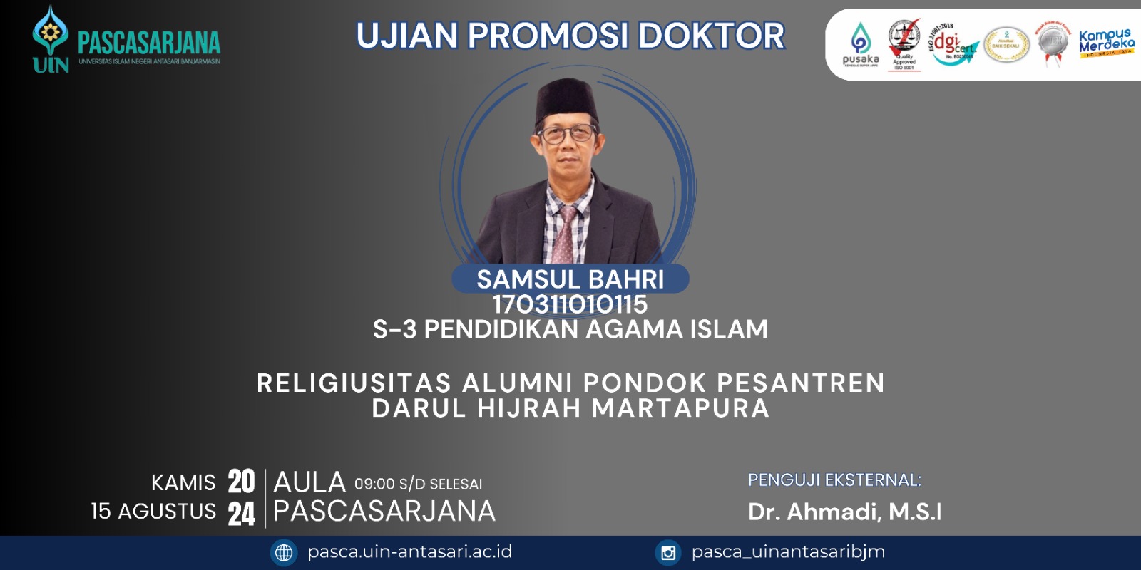 Samsul Bahri dengan NIM 170311010115 akan mempresentasikan hasil penelitian disertasinya dengan judul “Religiusitas alumni pondok pesantren darul hijrah martapura” Dengan penguji Eksternal oleh Prof. Dr. Ahmadi, M.S.I.