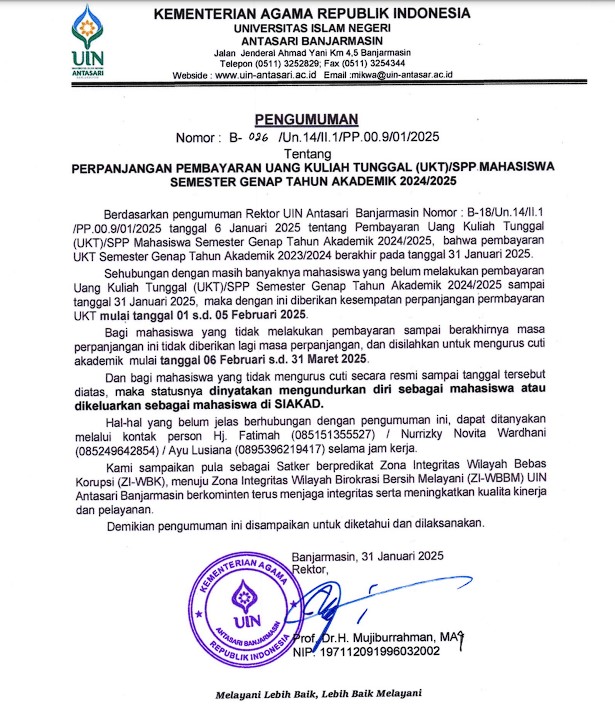 Perpanjangan Pembayaran UKT/ SPP Mahasiswa Semester Genap Tahun Akademik 2024/2025 Posted by Administrator Categories Pengumuman Date 31/01/2025 Share: Administrator Previous post Ujian Promosi Doktor Supriadi 31/01/2025 Next post PENDAFTARAN ULANG MAHASISWA PASCASARJANA SEMESTER GENAP 2024/2025 06/02/2025 You may also like Pendaftaran Wisuda Sarjana ke-89 dan Pascasarjana ke-59 03/04/2026 PENGUMUMAN PELAYANAN ADMINISTRASI MAHASISWA DAN PENYESUAIAN JAM KERJA ASN 14/03/2026 PENERIMAAN MAHASISWA BARU (PMB) PASCASARJANA UIN ANTASARI 2026 04/03/2026