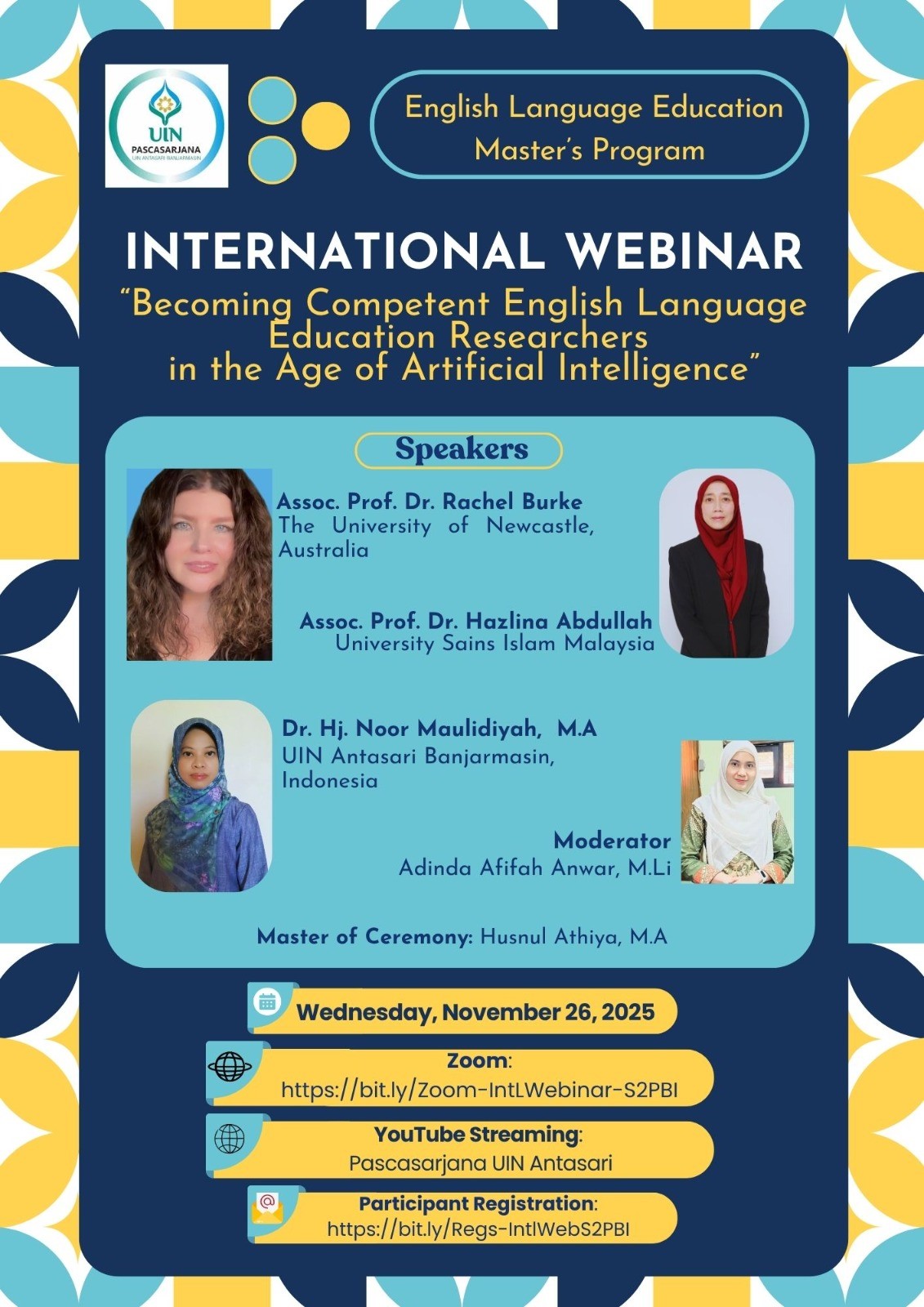 Banjarmasin, November 26, 2025 — The Master’s Program in English Language Education (S2 PBI) of the Postgraduate Program of Universitas Islam Negeri Antasari Banjarmasin recently hosted a successful International Webinar that attracted the attention of academicians, researchers, and education practitioners. The webinar, themed “Becoming Competent English Language Education Researchers in the Age of Artificial Intelligence,” took place on Wednesday, November 26, 2025, via Zoom and was attended by hundreds of participants.