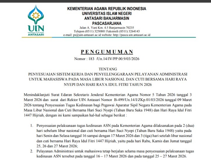 Menindaklanjuti Surat Edaran Sekretaris Jenderal Kementerian Agama Nomor 5 Tahun 2026 tanggal 3 Maret 2026 dan surat dari Rektor UIN Antasari Nomor B-499/Un.14/I/ZKp.01/03/2026 tanggal 09 Maret 2026 tentang Penyesuaian Tugas Kedinasan bagi Pegawai Aparatur Sipil Negara Kementerian Agama pada Masa Libur Nasional dan Cuti Bersama Hari Suci Nyepi (Tahun Baru Saka 1948) dan Hari Raya Idul Fitri