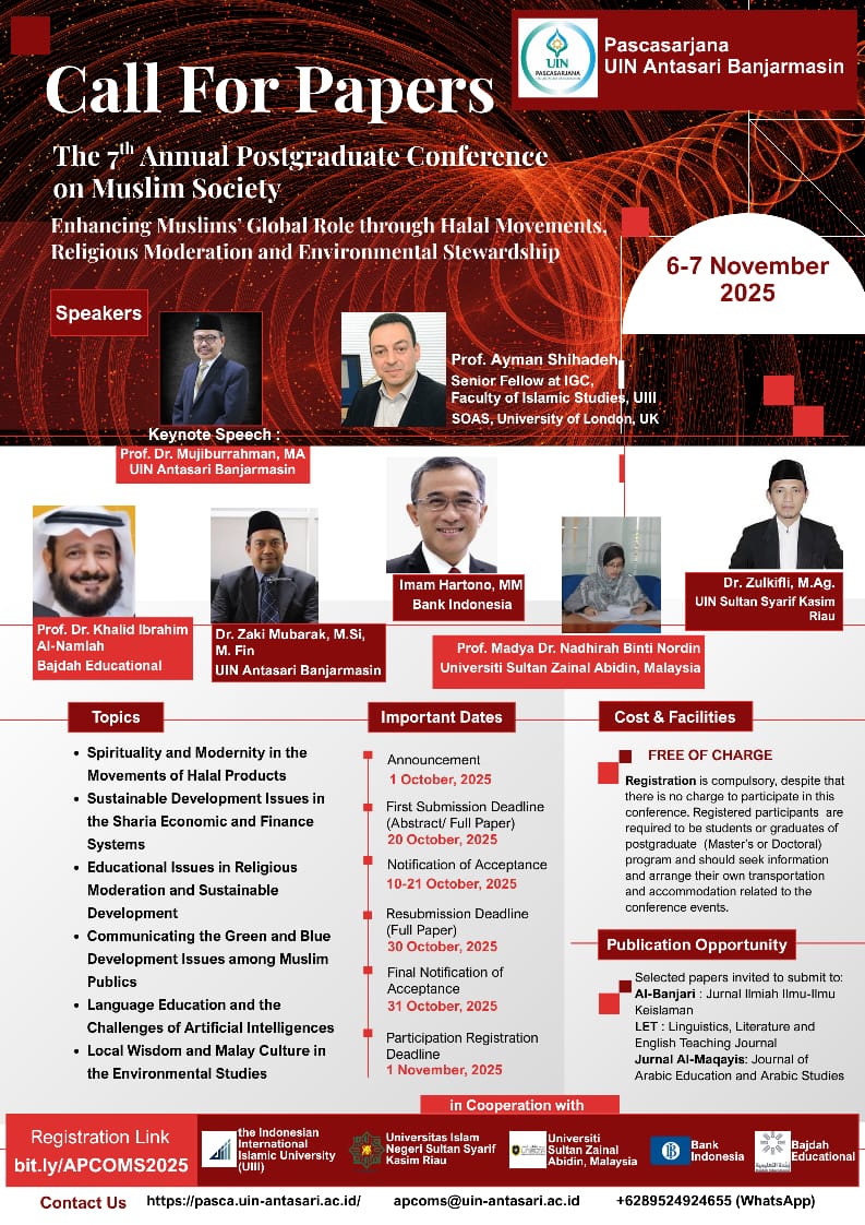 CALL FOR PAPERS THE 7th APCoMS Pascasarjana UIN Antasari Banjarmasin Invite scholars researchers, practioners to contribute to: 2025 Annual Postgraduate Conference and Muslim Society (APCoMS) “Theme : Enhancing Muslims’ Global Role through Halal Movements, Religious Moderation and Environmental Stewardship” 📅 …